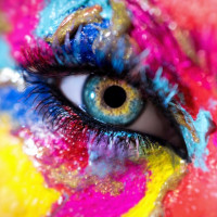 The image features an eye with blue and yellow colors, surrounded by a colorful paint or makeup application that is spread across the face. This creates a vibrant and artistic appearance, resembling a painting or face painting commonly used in festivals or as part of a creative expression.