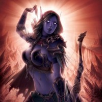 a female character depicted in the fantasy art style, specifically within the context of "Drow," which refers to dark elves in various fictional universes. The character appears as a warrior or huntress with purple skin and striking features such as