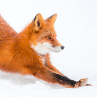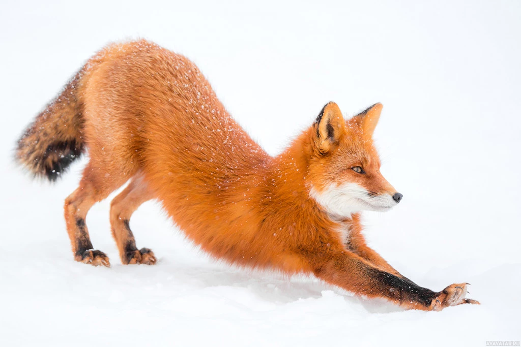 Картинка показывает лису в снежной среде, которая, кажется, растягивается или зевает. Это распространенное поведение для животных растягиваться после периода отдыха или сна. Шерсть лисы кажется плотной, и ее глаза сосредоточены на чем-то вне рамки, возможно, наблюдая за добычей или наблюдая за ее окружением.