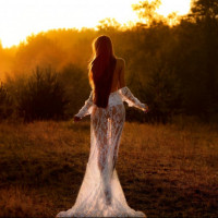 The image shows a person, specifically a girl, standing in what appears to be a field during sunrise or sunset. She is wearing a dress that could be considered