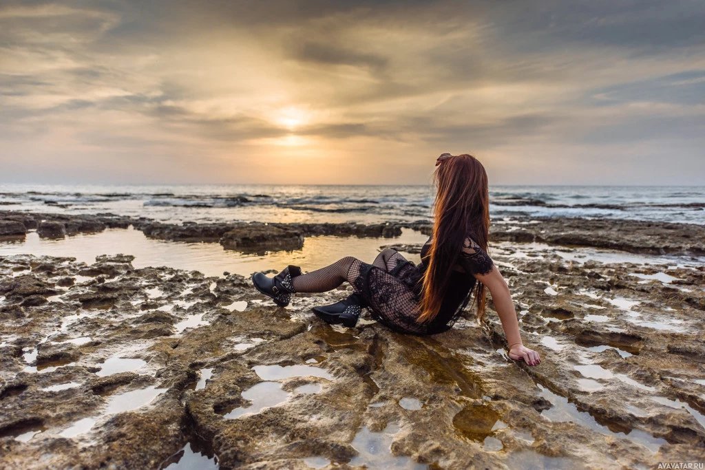 На картинке изображен человек с рыжими волосами, лежащими на спине на скалистом пляже на закате. Солнце садится позади человека, создавая силуэтную видимость его тела и головы. Человек, кажется, расслаблен или отдыхает в этой естественной обстановке.