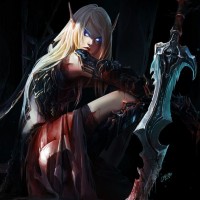 a fantasy character that appears to be an elf. The elf is depicted in a dark and moody setting, possibly a dungeon or crypt, given the presence of what looks like chains and spikes. The elf is holding a weapon that resembles a mix between a sword and an axe, which may suggest a role as a warrior or guardian. The character has