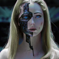 blonde hair and striking blue eyes. On her face, there appears to be a robotic or cybernetic component, which could suggest the theme of
