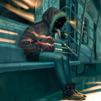 The image depicts a person sitting on what appears to be the front steps of a subway
