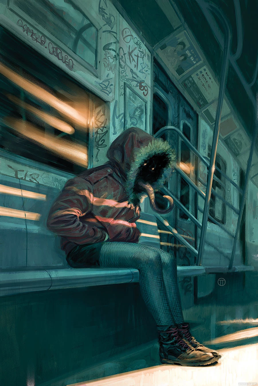 the muted colors and the graffiti-like markings on the subway car. The overall atmosphere suggests