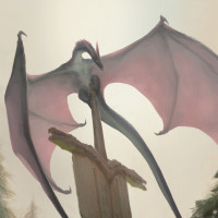 a fantastical scene with a dragon as the central figure. The dragon has large, spread wings and is perched on its