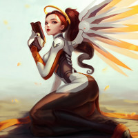 The image shows an illustration of a character from the video game "Overwatch." This character is Mercy, a hero with healing abilities in the game. She is depicted wearing her signature white and orange outfit, which includes wings that represent her angelic nature.