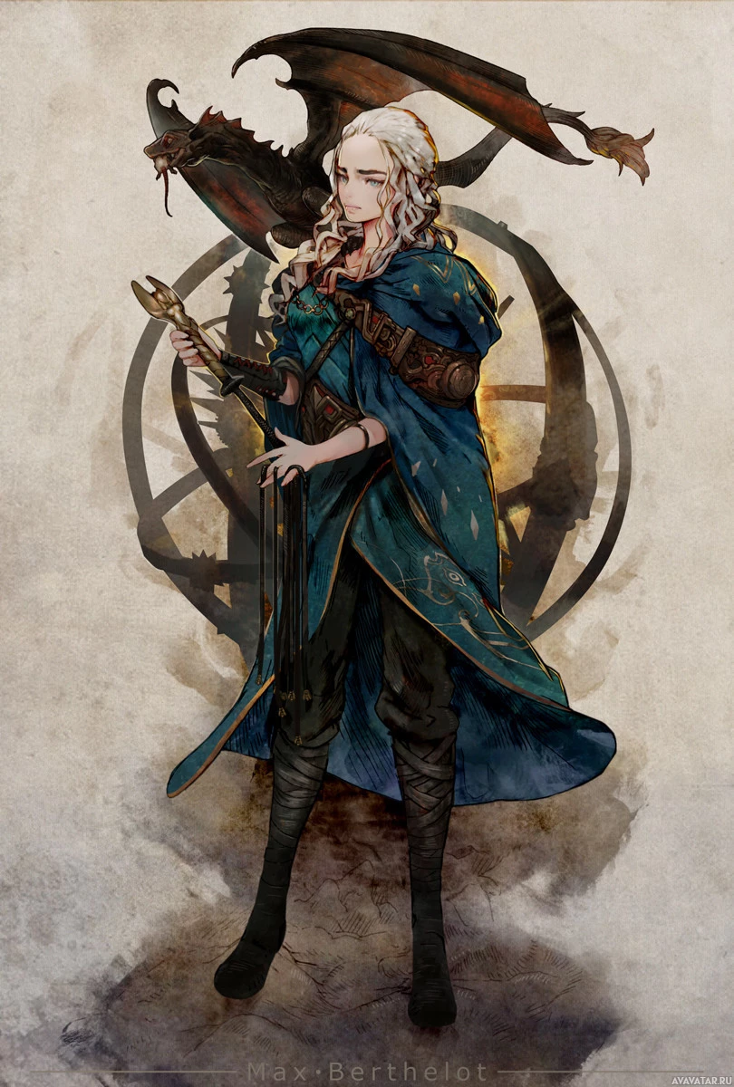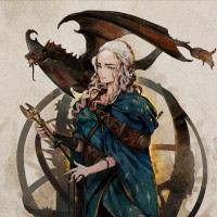 Daenerys Targaryen from the television series "Game of Thrones." The character is depicted holding a dragon's head and standing in front of