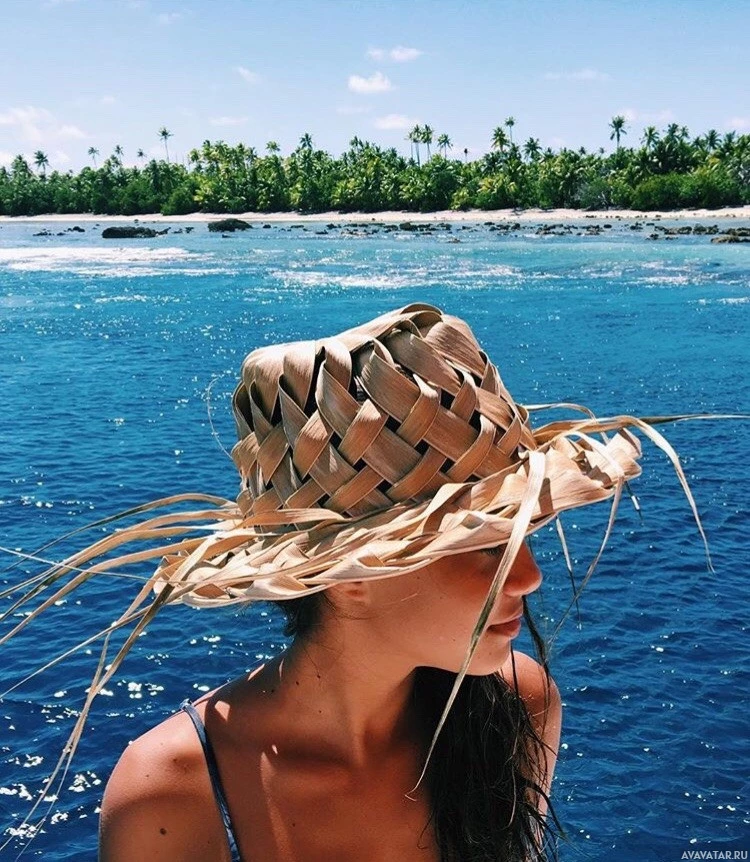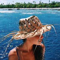 a straw hat or a boonie hat. She appears to be standing near water, possibly on a boat or close to the shore of an island, given the presence of