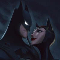 The image depicts two characters that are recognized as Batman and Catwoman from the DC