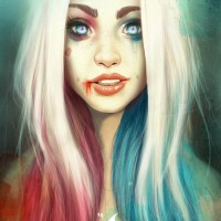 Harley Quinn from the comics and movies. The character has colorful hair, which is typical of the Harley Quinn persona, often associated with the Joker in