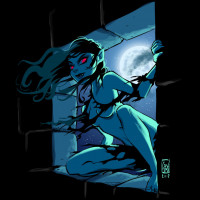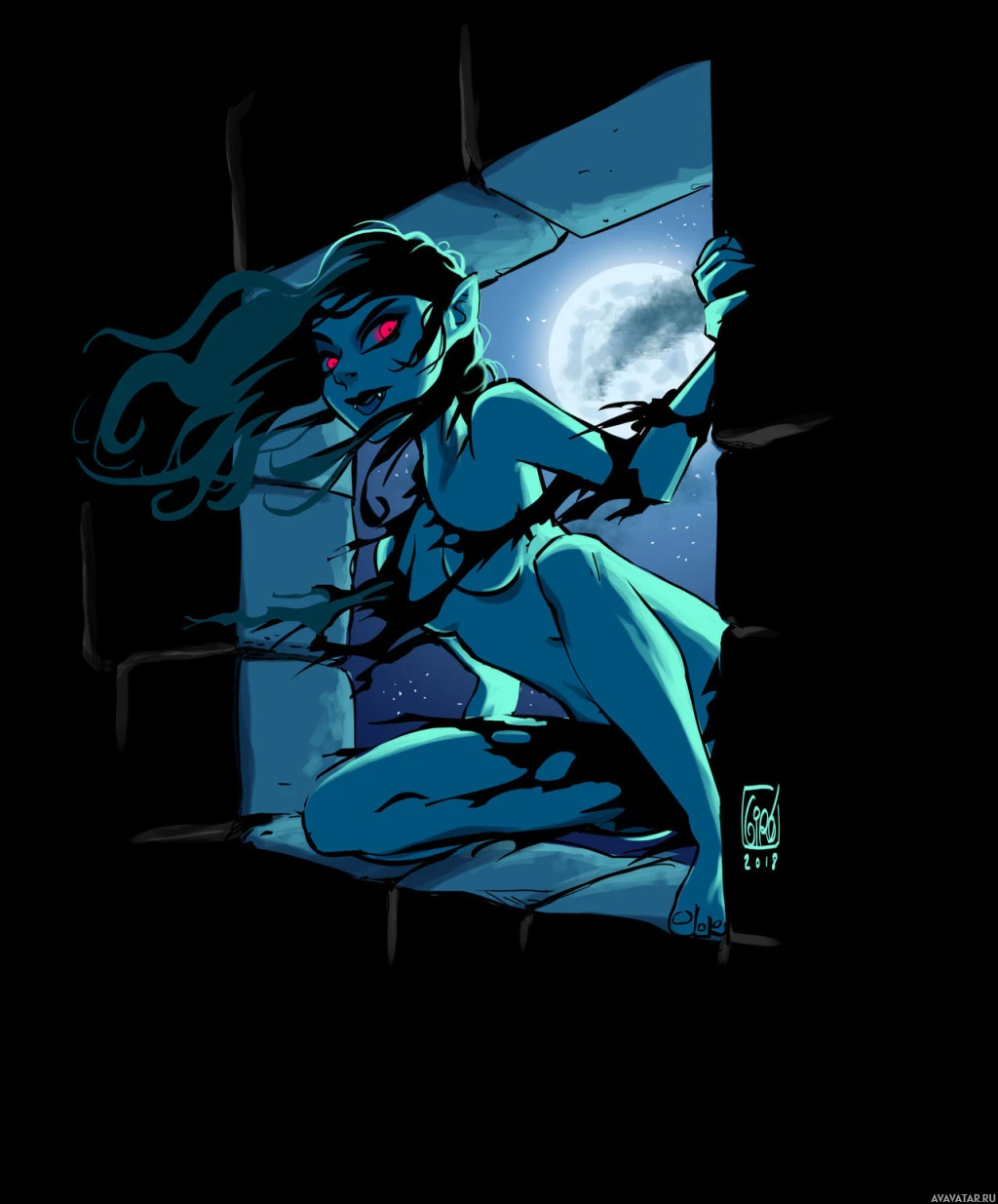 night sky, and there are what seem to be drips or splatters of something dark around her, possibly blood or a liquid indicative of her vampiric nature. There is also a signature visible in the bottom right corner of the image.