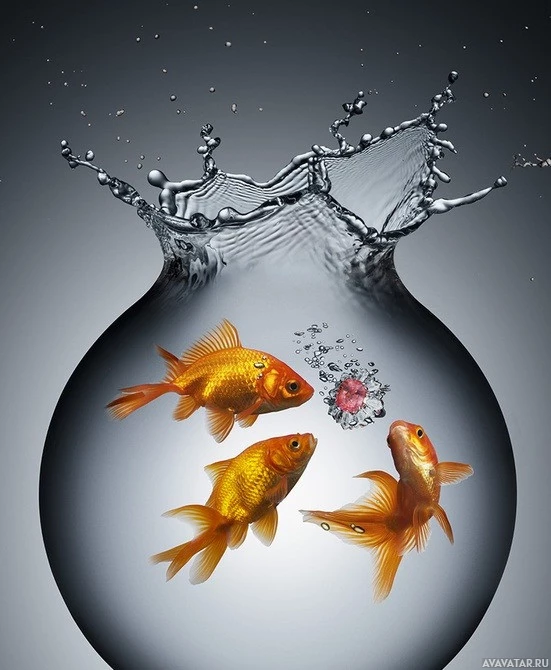 droplets of water suspended in mid-air, suggesting that they might be falling from an unseen source, or perhaps from the bowl itself. The fish seem to be observing something with interest below