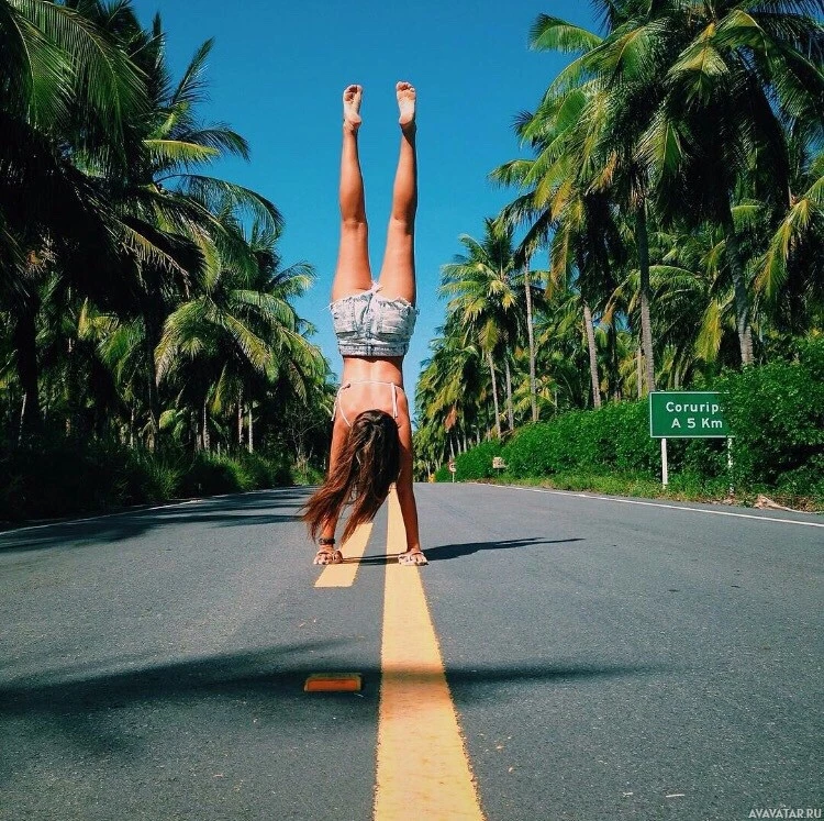 На картинке изображен человек, делающий стойку на дороге. Человек кажется перевернутым относительно угла камеры, который находится позади человека. По обеим сторонам дороги есть деревья и ясное голубое небо. Зеленый знак виден на расстоянии, но текст на нем не разборчив на этом изображении.