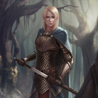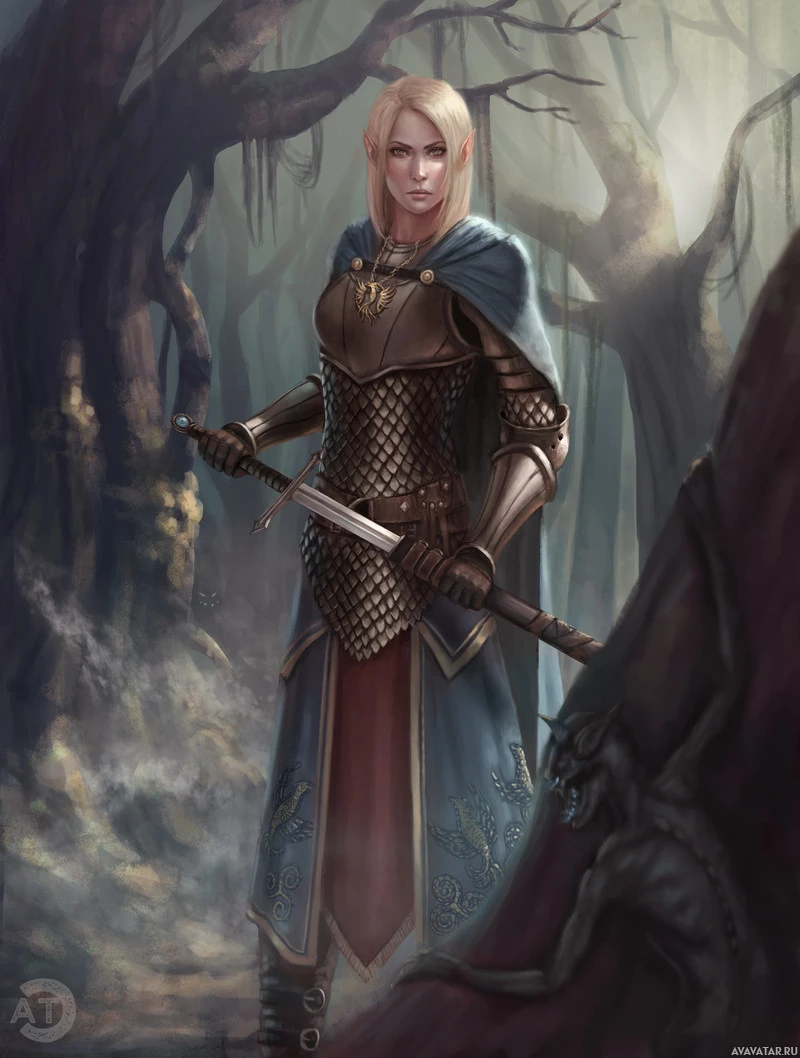 a fantasy scene featuring an elf character. This elf is dressed in what appears to be armor, suggesting a warrior or adventurer role. They are holding a sword in one hand and a staff with a spade-like head on the end in the other. The setting seems to be a forest or wilderness area, possibly at dawn or dusk given