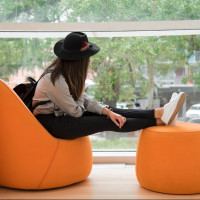 The image shows a young woman sitting on an orange-colored bean bag chair. She is wearing a black hat and appears to be looking out of a large window, which offers a view of trees and buildings outside. There's a backpack next to her, suggesting she might have been traveling or is in transit.