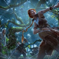 tree branch on the ground to the left of the girl. The overall atmosphere suggests a magical or enchanted forest environment.