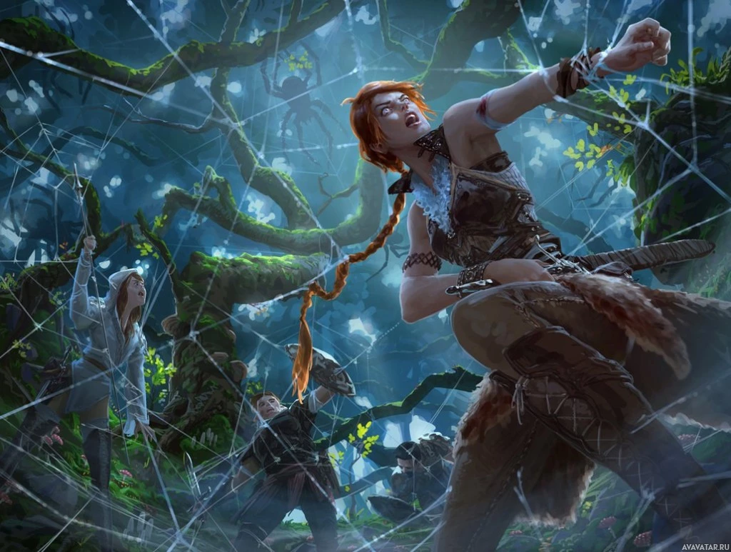 a fantasy scene with three individuals in what appears to be a magical forest setting. On the left, there is a girl with