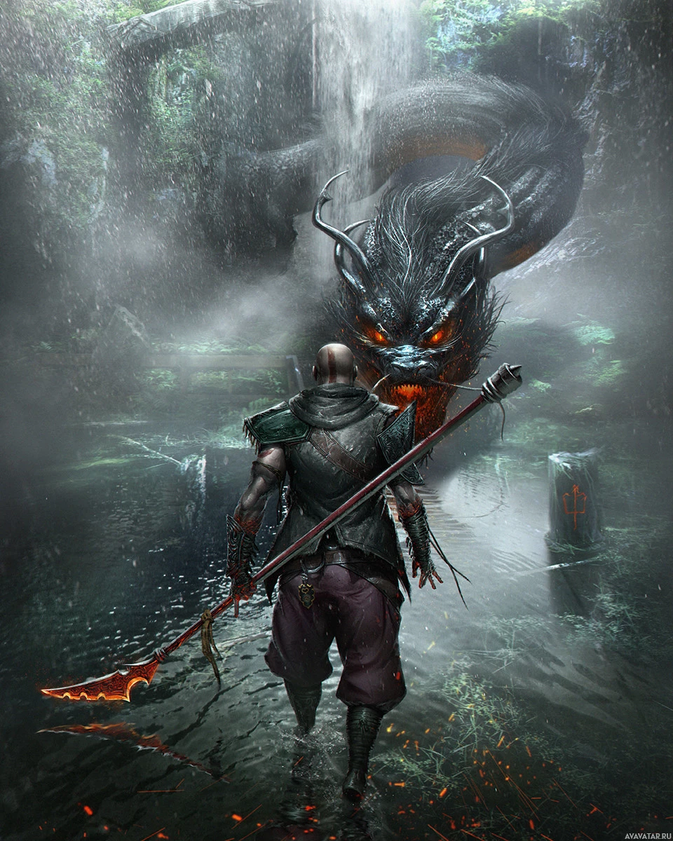 В образе есть человек, владеющий мечом и стоящий перед большим драконом. Место действия кажется лесом или джунглями с туманным окружением. Атмосфера предполагает сцену из фантастического повествования, где персонаж может столкнуться с опасным существом, таким как дракон.
