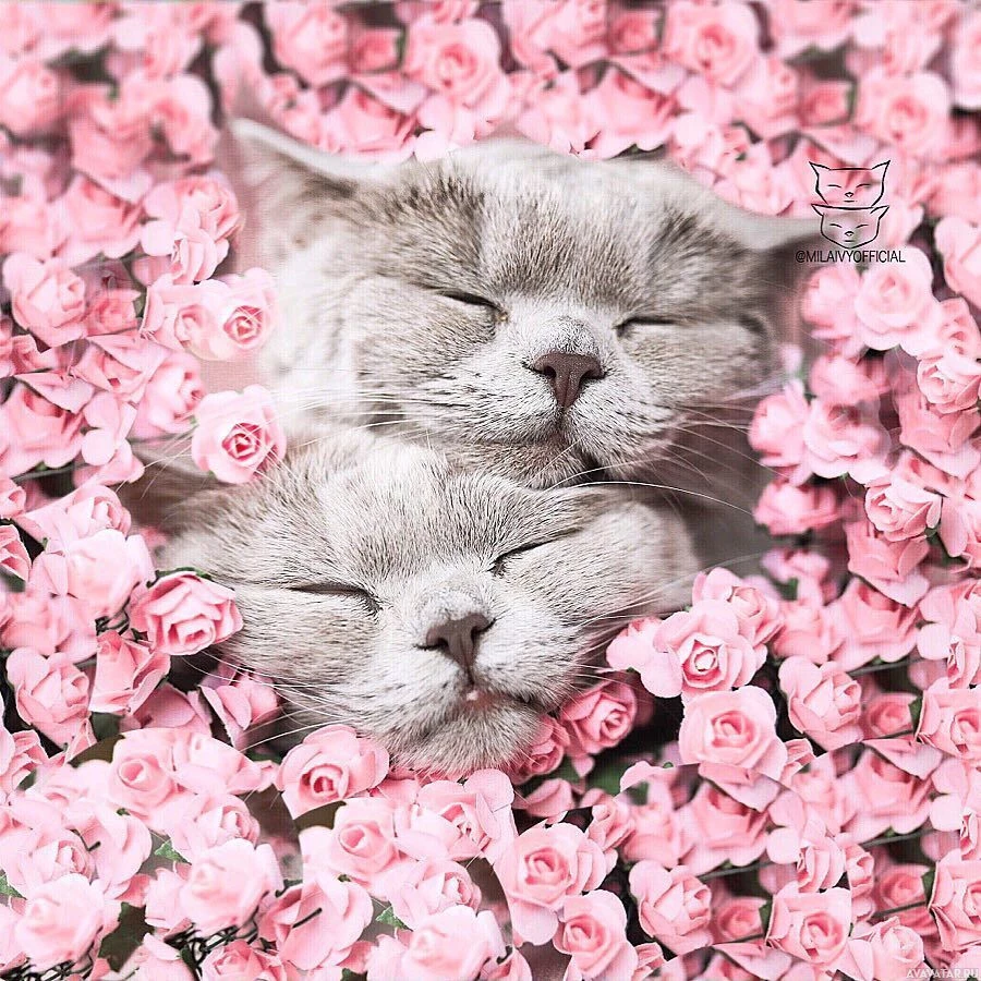 pink flowers, creating a soft and serene atmosphere. This picture has been edited to have a second set of eyes appear behind the cat, giving it an almost human-like appearance of being able to "see" through its