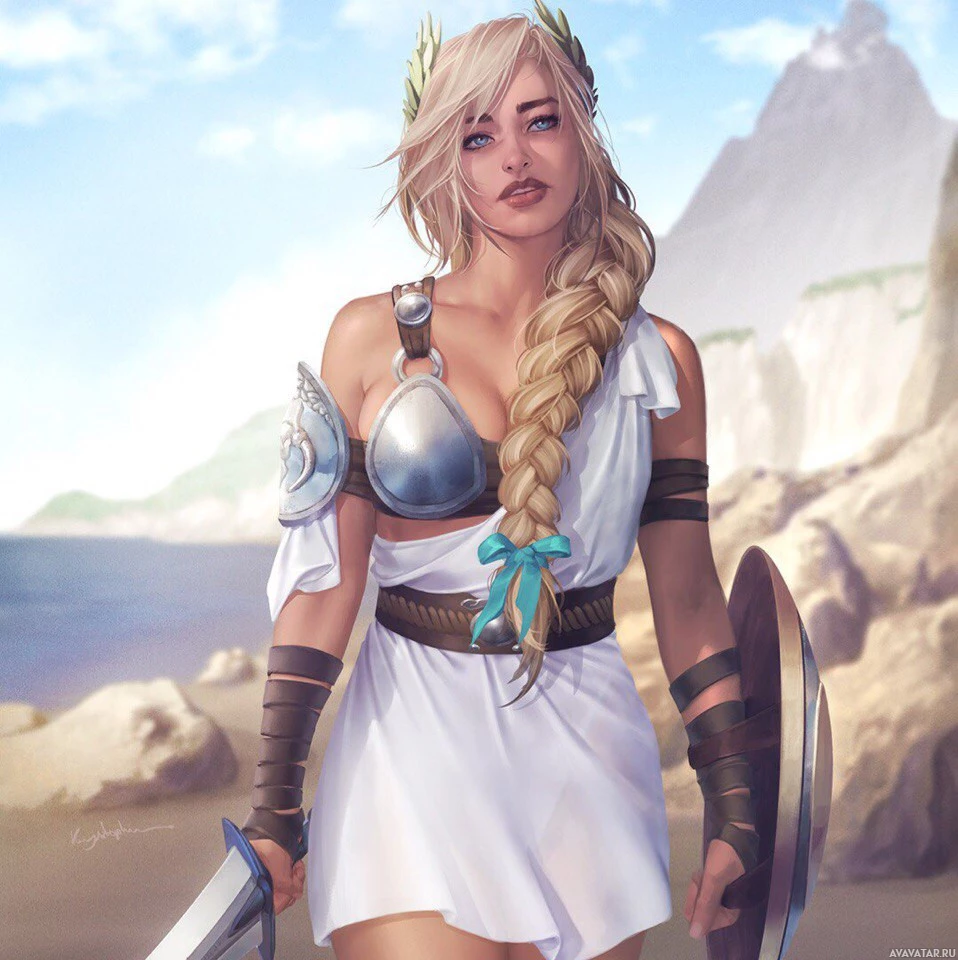 blonde hair styled in braids and is wearing a white dress with gold accents that are reminiscent of ancient Greek or Roman armor. The setting appears to be a beach with