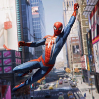 an urban setting that resembles Times Square, New York City. The character is dressed in his iconic blue and red costume with a distinctive spider