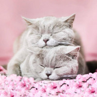 close proximity, almost on top of each other, with their heads touching. Both cats have their eyes closed, and they seem relaxed. This is