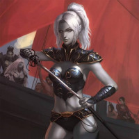 white hair styled in a bun and is wearing armor with gold accents, including a breastplate and gauntlets. In her right hand, she holds a sword. Behind her are other characters that appear to be from the same setting or storyline, possibly indicating