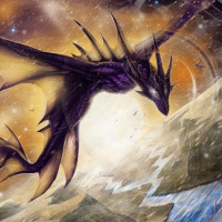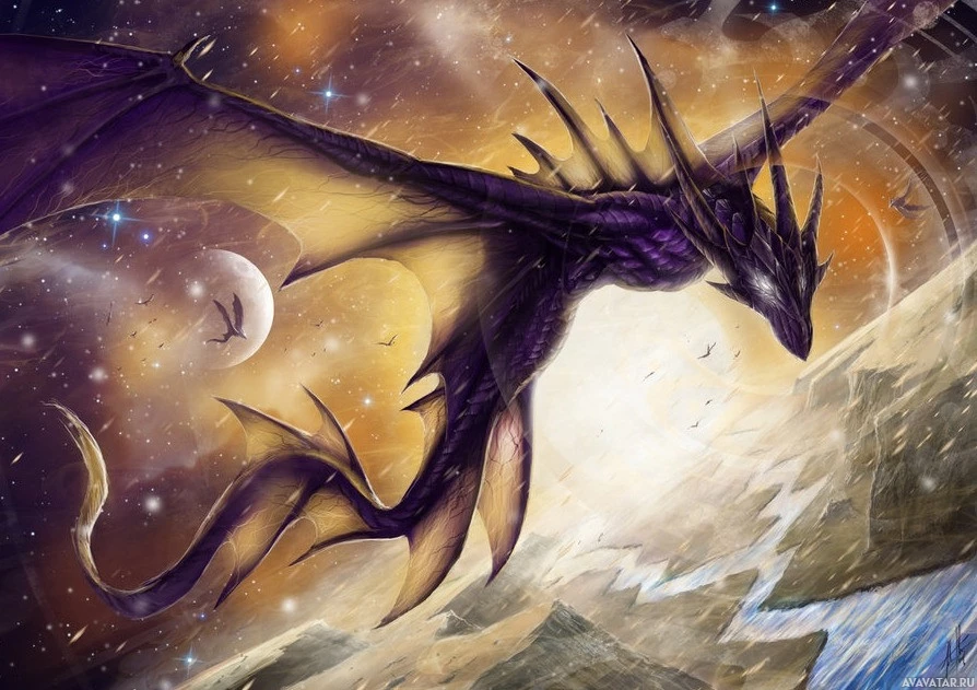 a fantastical scene featuring a dragon. The dragon is purple and yellow with