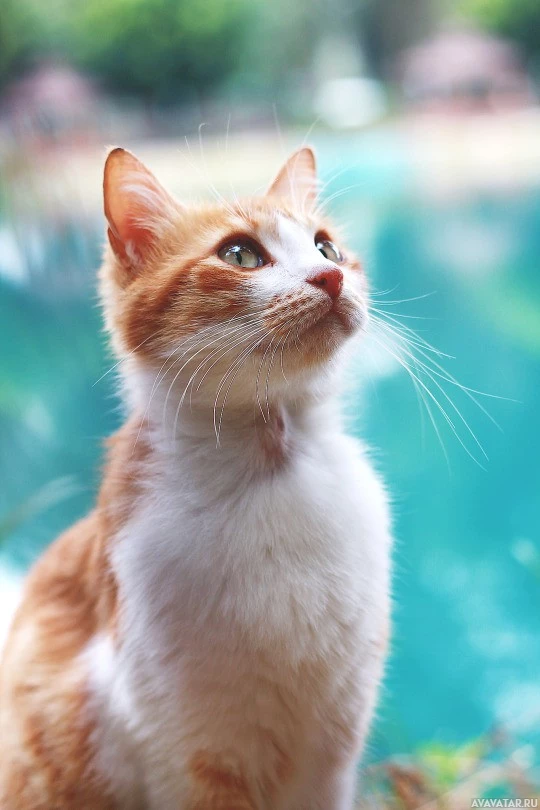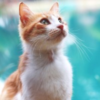 tabby markings on its face and body. The cat is sitting upright, looking slightly upward towards the camera, giving it an attentive or curious expression. The background appears to be a calm