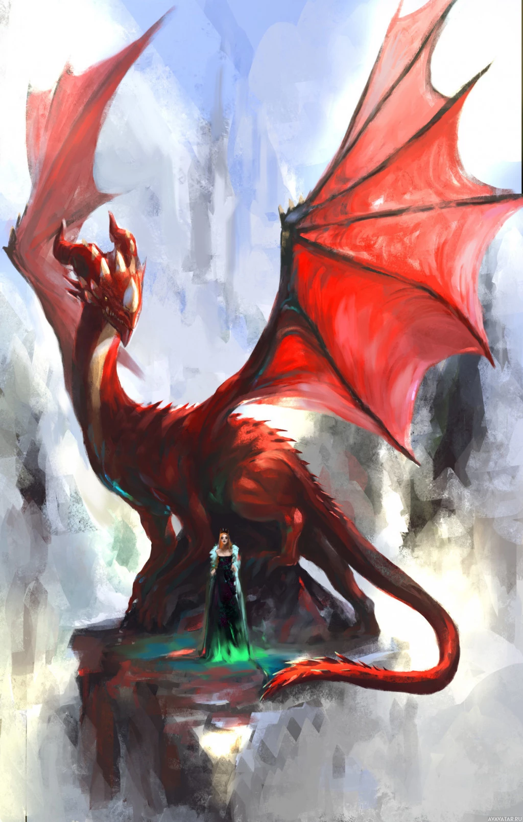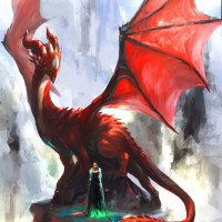 a fantasy scene featuring a large, fierce red dragon with prominent wings and a menacing expression. In front of the dragon stands