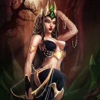 intricate designs, which adds to her mystical appearance. The background gives off a forest-like atmosphere, possibly indicating she is in a natural, woodland setting.