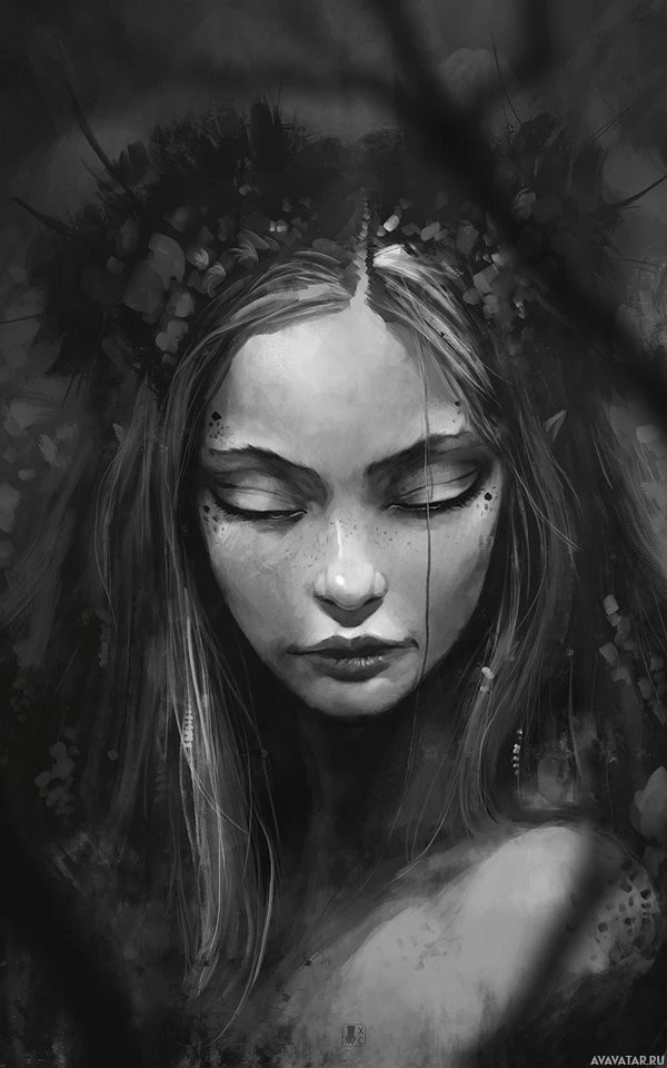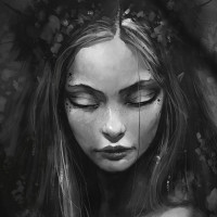 a moment of peace or contemplation. Her features are detailed with a soft, ethereal quality to her skin and hair, which adds to