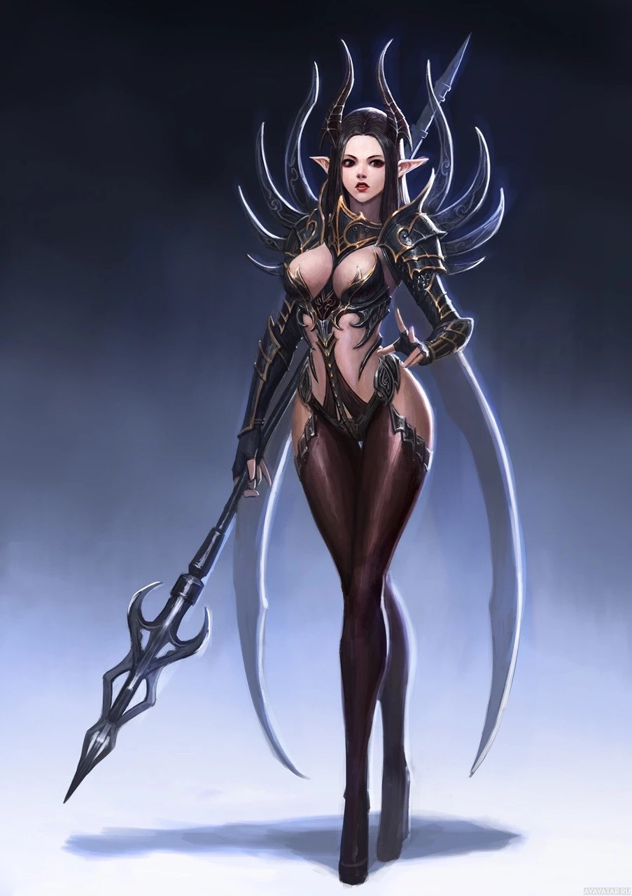 fantasy settings, and is holding a weapon that looks like a bladed spear with a curved blade. This character is drawn with