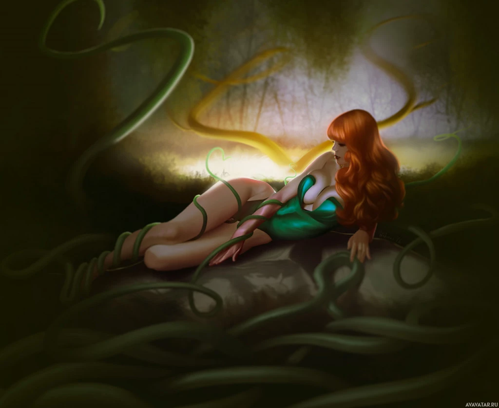 a fantasy scene with a red-haired girl lying on the ground, surrounded by lush greenery and vines. She is wearing a green bodysuit that blends in with her surroundings, suggesting she may be part of nature or perhaps a character from