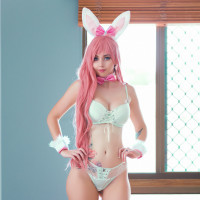 The image shows a person wearing lingerie and a bunny ears costume, possibly for cosplay or a themed event. They are standing in an indoor setting with windows that let in natural light, giving the scene a bright and airy feel.