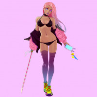 a bikini top and a black coat, giving her an edgy look. The character is holding two swords crossed in front of her, suggesting she may be a warrior or a figure from