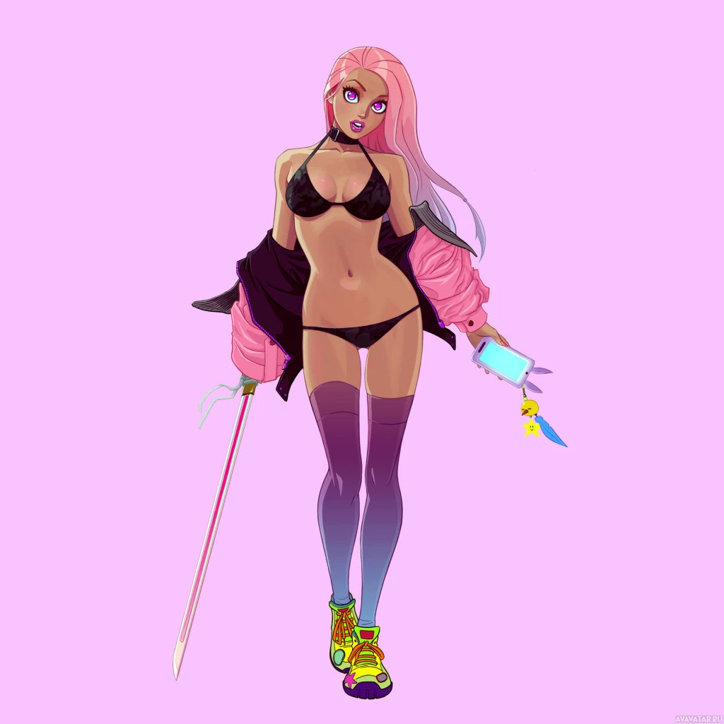 animated character that appears to be a woman with pink hair and a unique style, combining elements of fantasy and modern fashion. She has pinkish-