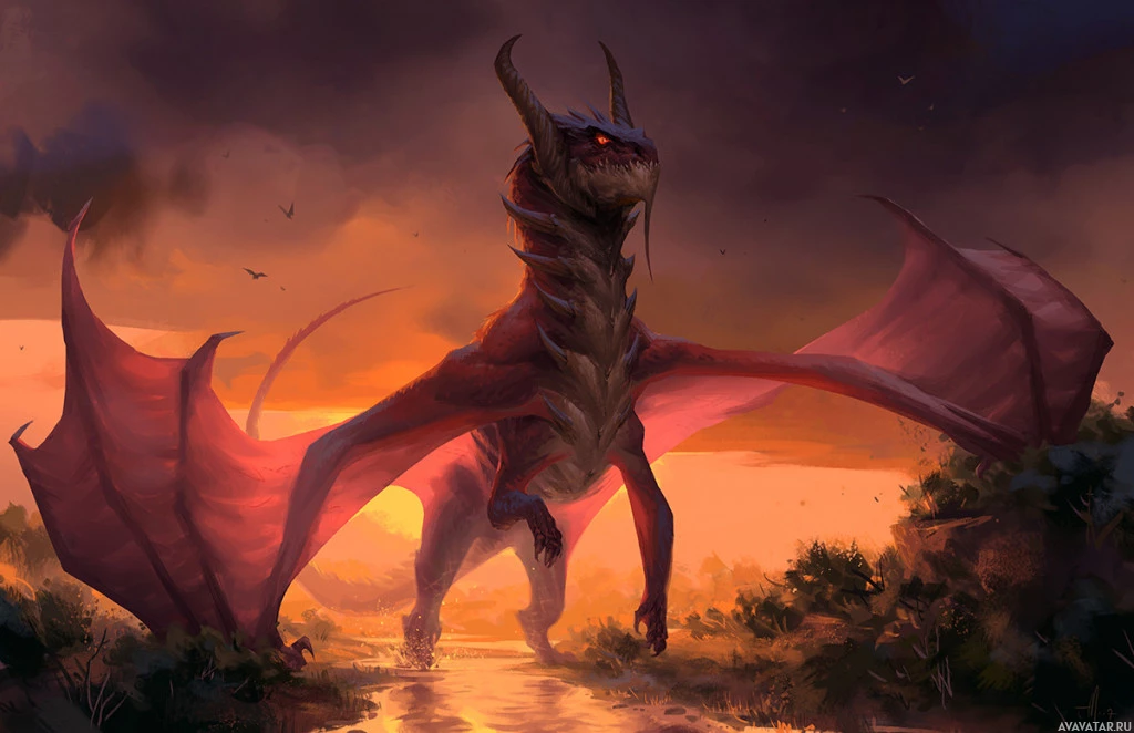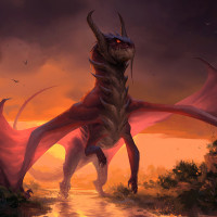 setting sun is casting a warm glow on the scene, which might indicate either dawn or dusk. The dragon has prominent wings and scales, typical characteristics associated with such