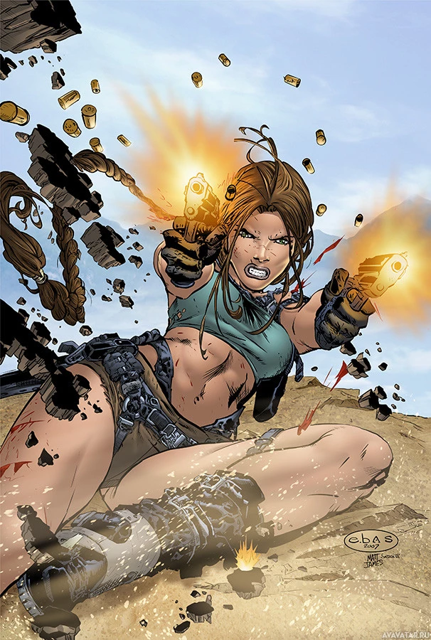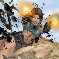 a female character, possibly Lara Croft from the "Tomb Raider" series of games, in action. She is holding two pistols and shooting them at what appears to be enemies or targets in front of her. The setting suggests
