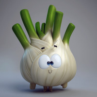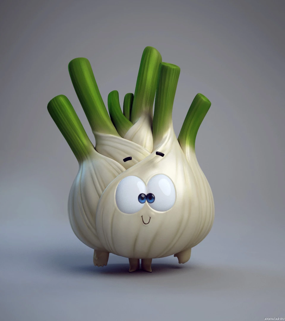The image shows a 3D rendering of a cute, anthropomorphic garlic bulb with a face. It has big, round, white eyes, a simple smile, and is wearing a yellow