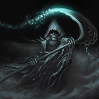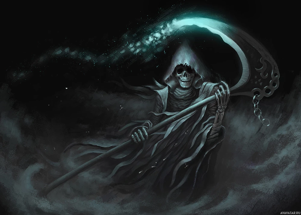 the Grim Reaper, a symbol often associated with death in various cultural and mythological contexts. This figure is typically portrayed as skeletal or in some cases, with