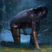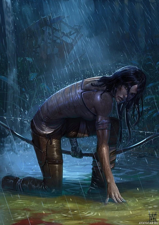 the video game series "Tomb Raider." She is depicted in a rain-soaked