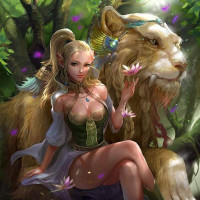 green foliage indicative of a forest or woodland environment, and there are small flowers blooming around them. The overall atmosphere of the image suggests a peaceful coexistence between the elf and the lion, possibly hinting at a bond or friendship in