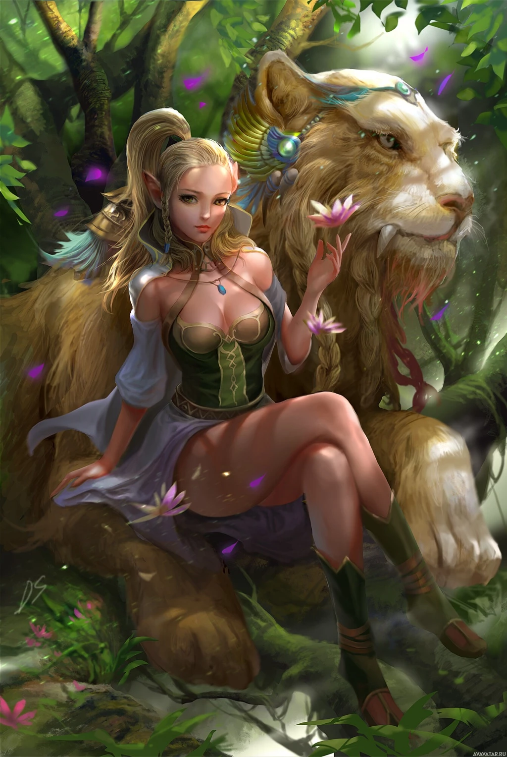 fantasy scene with a humanoid elf character sitting beside a large, majestic lion. The elf has