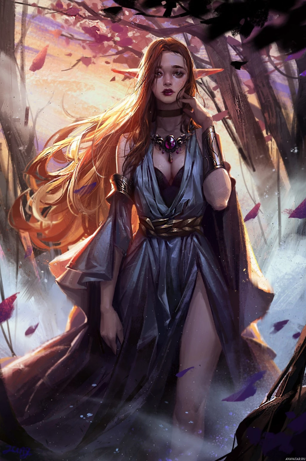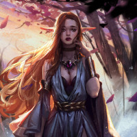 red hair and is wearing an elegant outfit that includes a cloak or draped garment with gold accents, which suggests she might be of noble status within the fantasy context where the image is set. The setting appears to be a forest at what could be either dawn or dusk, given