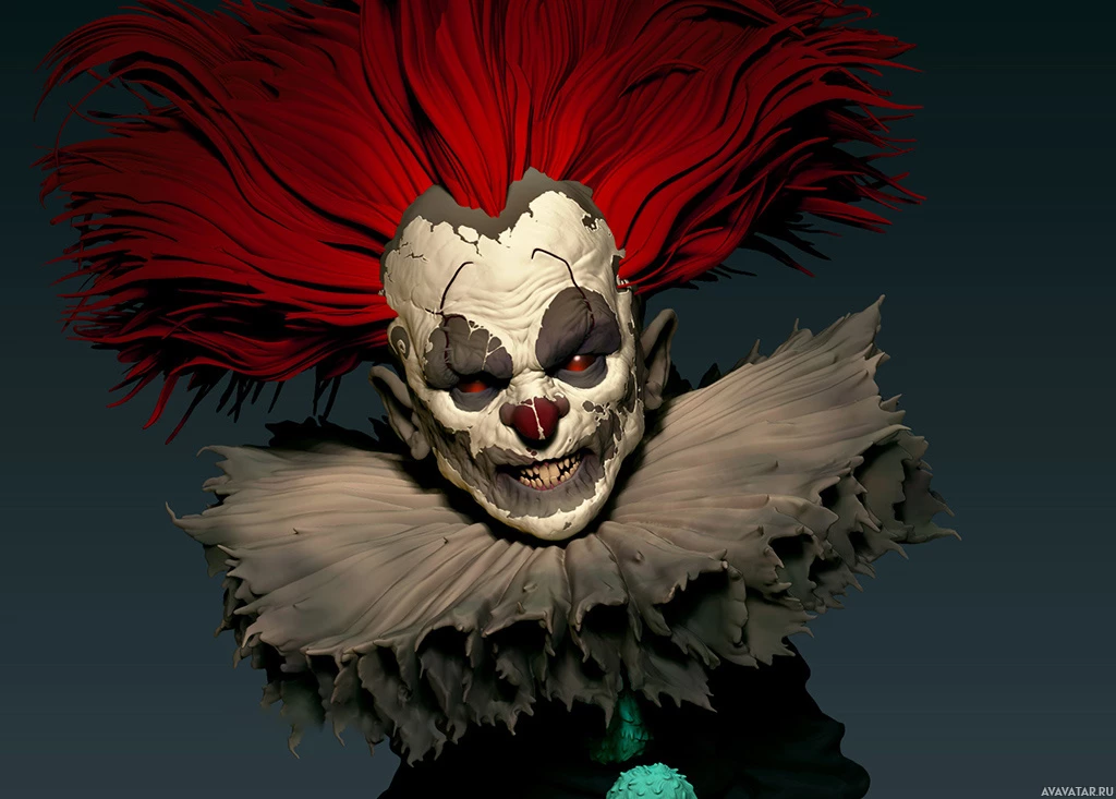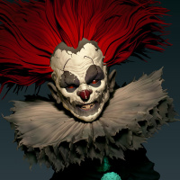 a menacing expression on its face. The style is reminiscent of clowns often found in