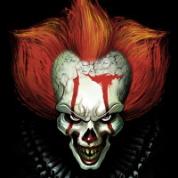 The image features a clown-like figure with striking