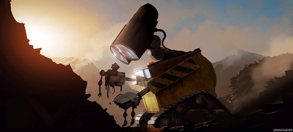 an animated movie featuring a robot. The central figure is WALL-E, who appears to be interacting with another character or object that is not fully visible in the frame. The setting seems to be a desolate landscape during either dawn or dusk given