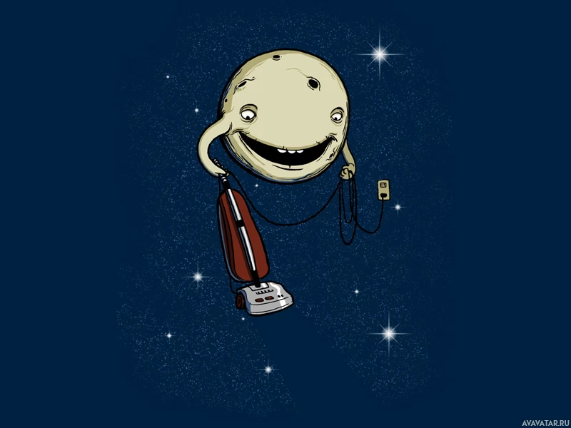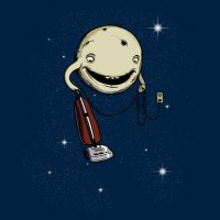 The image features an anthropomorphic depiction of the Moon, with a face that includes eyes and a mouth. It is holding what appears to be a cord or wire attached to